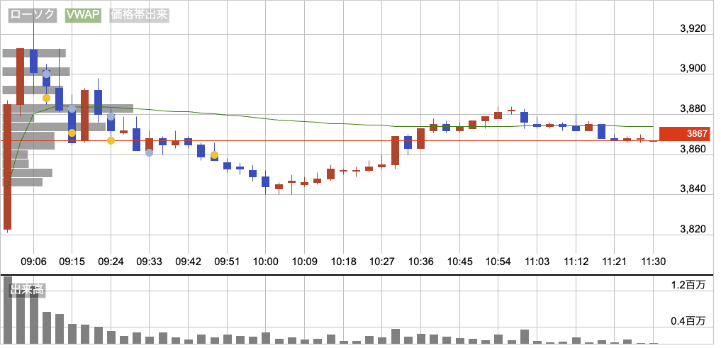 三菱重工は0.6%のGDでスタート。寄りから数分で100円以上の急騰を見せたけど、そこが天井で一気に下落。10時頃には寄り付き水準まで戻して、まさに往って来いの展開。その後は下げ止まりから反転して再び上昇に向かい、前場後半は持ち直し。急騰→急落→反発と、ボラの大きさが目立つ動きだった。