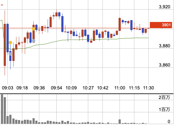 三菱重工は前日比1.6%のギャップダウンで3862円スタート。寄り付き直後に約60円上昇し前日水準まで戻したが、そこが天井となり失速。以降はVWAP上で方向感なく横ばい推移が続き、上値の重さが目立つ前場だった。