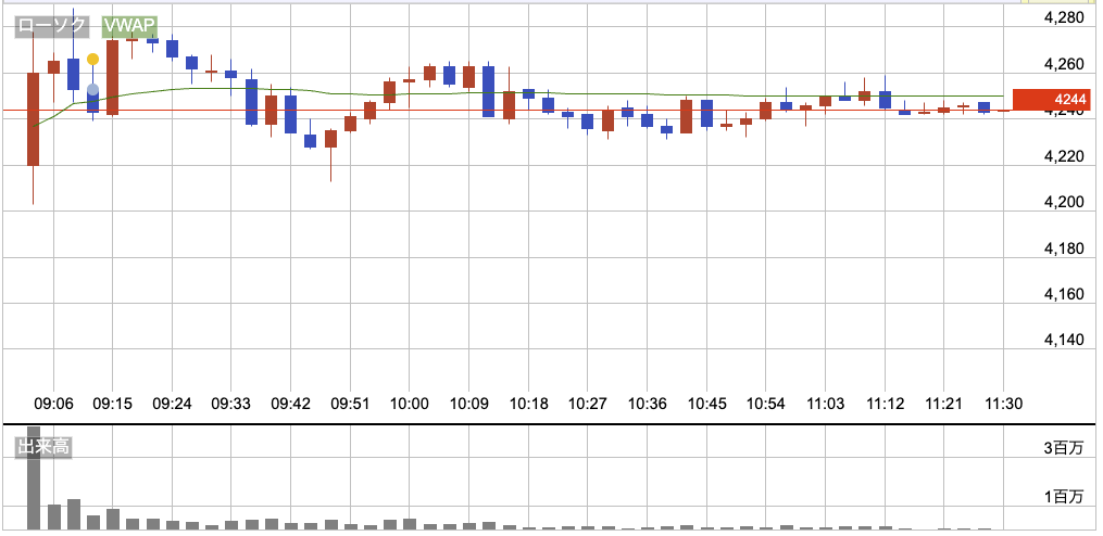 三菱重工は2.4%ギャップアップの4,220円でスタート。寄りで勢いあるかと思いきや、その後は上にも下にも抜けずヨコヨコ。方向感なくて、入るタイミングも見つからない微妙な展開。