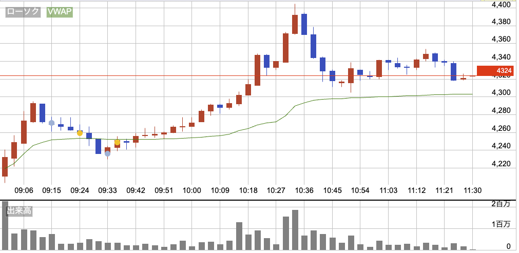 1.3%ギャップダウンの4,211円でスタート。序盤は買いが入り4,295円まで上昇。その後いったん4,230円まで押したものの、再び強い買いが入り勢いよく反発。