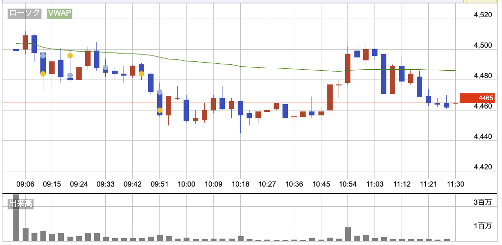 前日比+2%の4500円で寄り付き、安値の4450円付近との間で行ったり来たり。4500円がしっかりとした抵抗線に機能し、上下動は限定的でヨコヨコ展開が続いた。