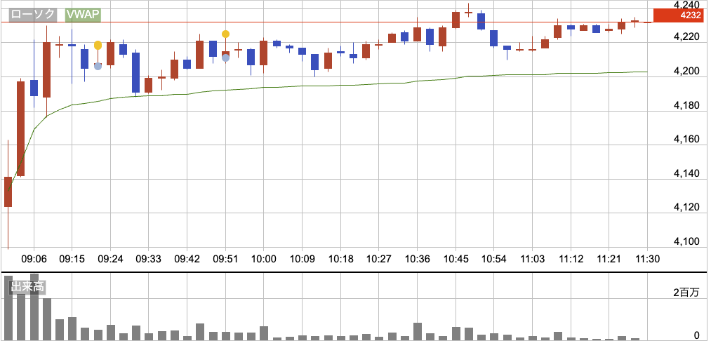 今日は1%ギャップアップの4124円でスタート。寄り付きから買いが強くて、そのまま4200円台前半まで強く上昇。その後は勢いが落ち着き、上目線をキープしながらヨコヨコ相場に移行。