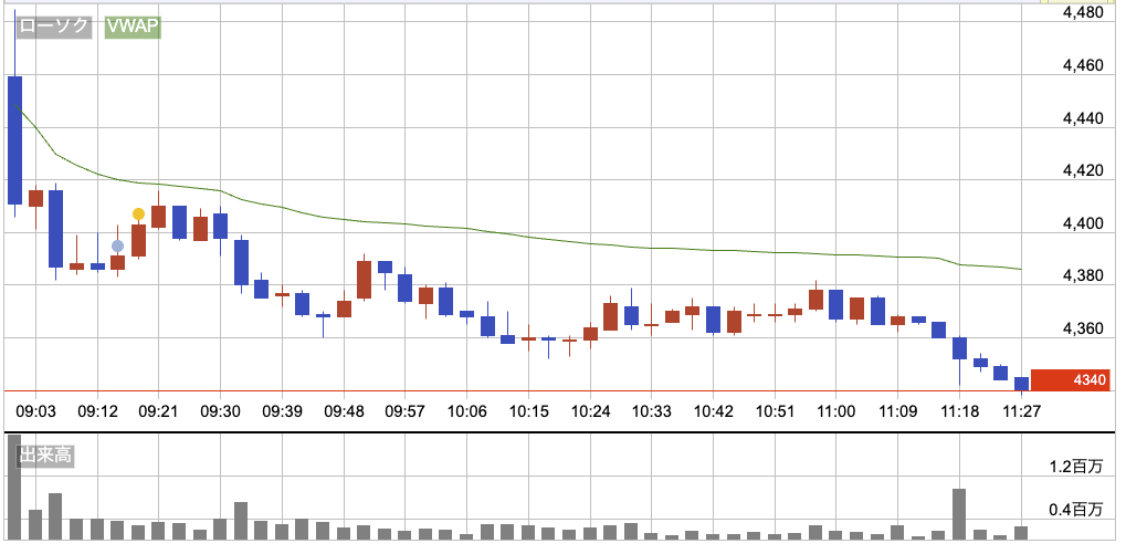 昨日とほぼ同値の4,459円でスタート。寄り付きから売りが強く終始VWAP以下で安値を更新していく展開。地合いは強かったけど、三菱重工は全く上に向かう動きがなく、下方向への圧力が続いた。全体の流れとは逆行するような弱い展開だった。