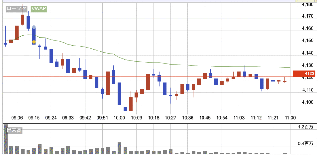 2%弱の下げで4,150円スタート。寄り付き直後は少し上に振れる動きもあったけど、すぐに反転して下方向へ。そこからはじわじわ安値を更新していく形で、全体的に売りが優勢な展開だった。