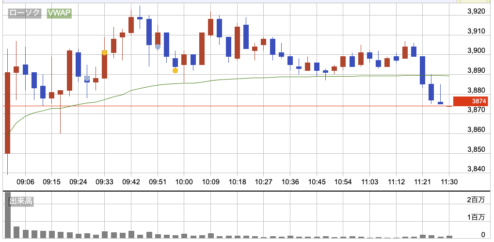 前日とほぼ同値の3,850円でスタート。前半は買いが入って3,900円をわずかに超えるところまで伸びたけど、そこからは失速。強さが続かず、後半はじりじりと力が抜けていき、結局は寄り付き付近まで押し戻されて引け。短い上昇だけ置き土産にした前場だった。