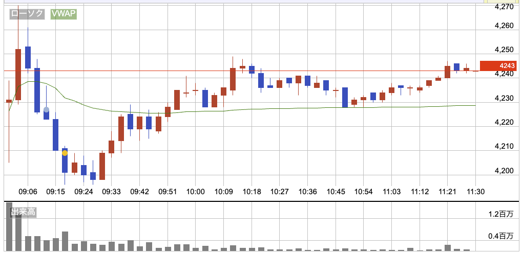 4,230円でスタート。寄り付きから買いが強くて、一気に40円くらい上まで持っていかれて、そこから急に雰囲気が変わって反転。そのまま70円くらい一気に落ちていく荒い展開。
