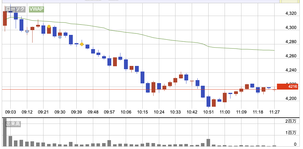 4306円でスタート。寄り付き直後は少し買われたものの、すぐに反転して下落へ。途中で戻しも入れながら、じわじわと安値を更新していく展開。