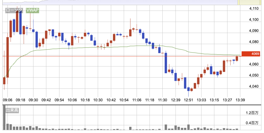 その後は売りが出て押されたけど、VWAP手前の4080円あたりで止まって反発。チャート自体は終始VWAPの上で推移していて、下げても深追いはされにくい印象だった。そのあとは大きな方向感は出ずヨコヨコした動きが続いた。
