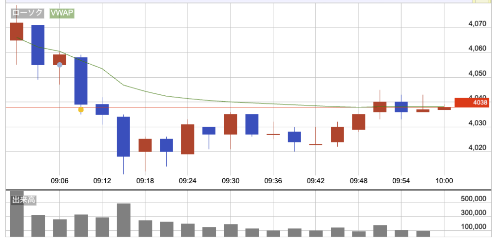 4000円手前でいったん止まり、そのあとは売りも買いも続かず、ヨコヨコ気味の上目線。10時直前には買いが強まり、前半の下げの半分くらいまで回復した。