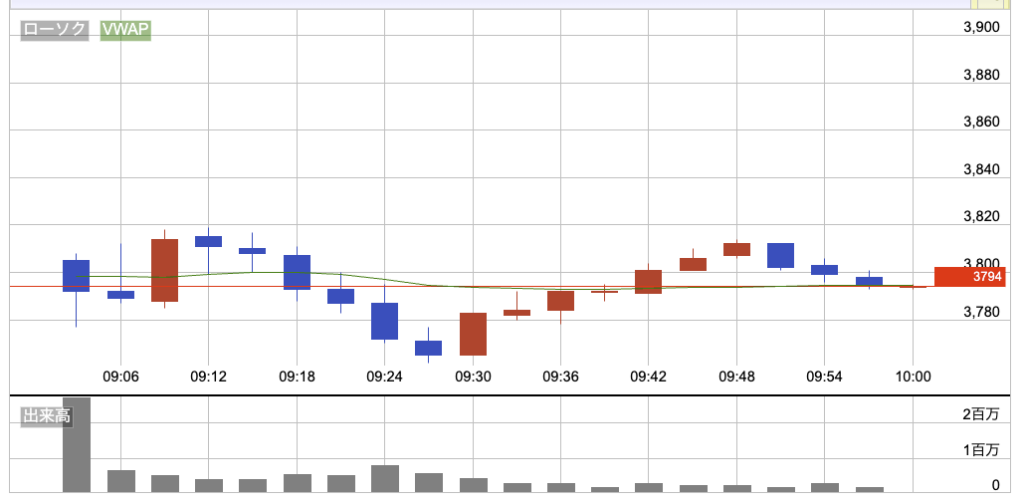 2.7%ギャップダウンの3805円でスタート。方向自体は日経と同じで、下げて戻してを繰り返す感じだったけど、値動きの荒さは三菱重工のほうが目立った印象。VWAPをまたいで上下に振られる場面が多く、日経よりも一回一回の動きが大きい。ヨコヨコというより、同じ方向感の中で振れ幅だけが大きくなっていて、落ち着かない9時台だった。