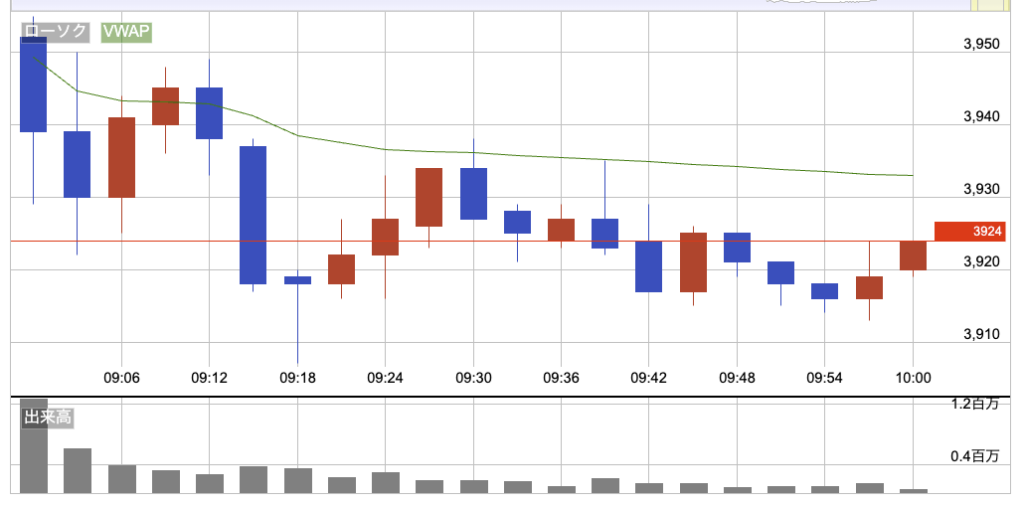 1.8%ギャップアップの3952円でスタート。9時台は下落基調で、VWAPの下をうろうろする展開。