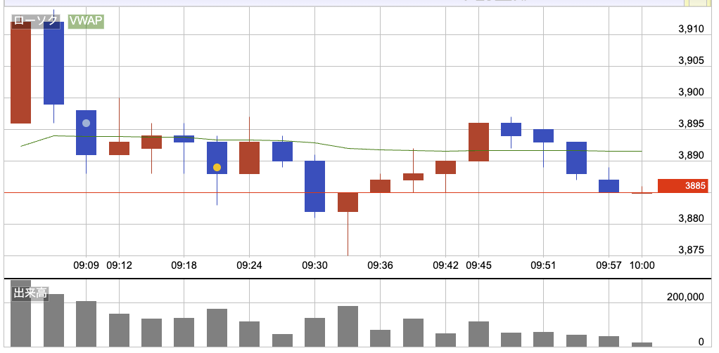 前日とほぼ同じ3885円でスタート。寄り付き直後は30円ほど上げて、いったん上を試すような動きになったけど、その後は反転して下落し、寄り付き水準まで押し戻された。
