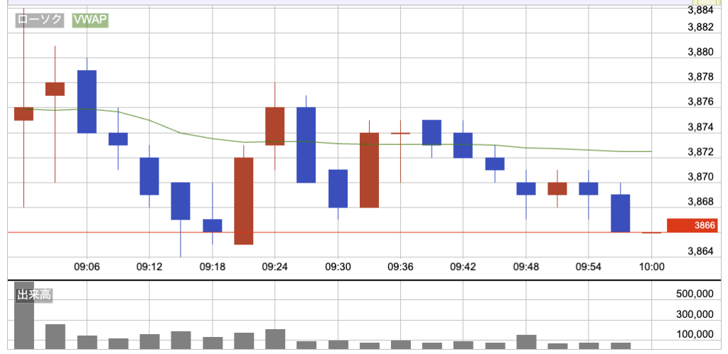 昨日とほぼ同じ3875円でスタート。とにかく板が分厚くて、数万株単位の注文が常に並んでる状態。上下どっちにも行きにくく、VWAPを挟んでひたすらヨコヨコ。