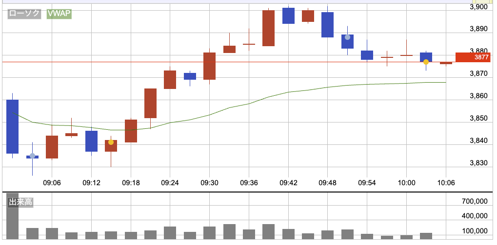 前日とほぼ同じ水準の3860円でスタート。寄り付き直後は少し売られて、3830円付近まで下げる場面があったけど、そこで一旦落ち着いた印象。その後はジワジワと買い戻されていって、寄り付きの価格を超え、3900円前後まで上昇。