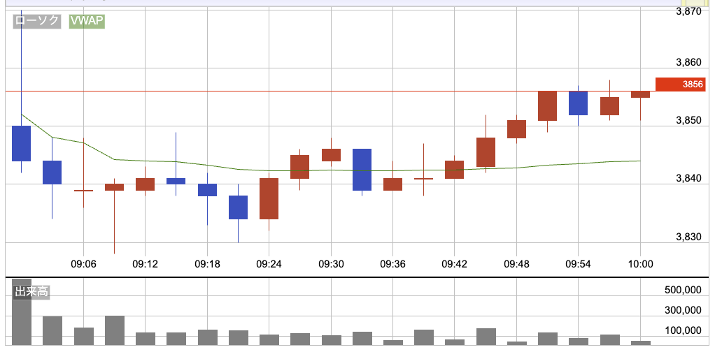 昨日より1%弱下げの3850円でスタート。寄り付きの数分は少し動いたけど、そのあとは一気に落ち着いて、ほぼVWAPを行ったり来たりするだけの展開。
