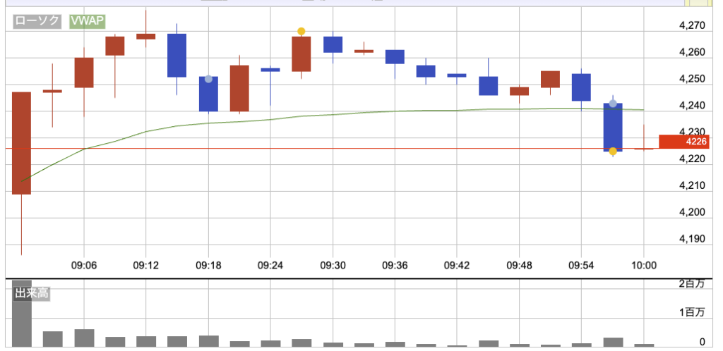 1.2%ギャップダウンの4209円でスタート。寄り後の前半は4278円まで上げて上目線の動きだったけど、買いは続かず失速。