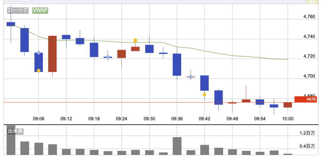 前日比で50円弱下げた4757円でスタート。寄り付き直後から売りが強く、いったんヨコヨコになる場面もあったけど、買いは続かず再び下方向。9時台のうちに寄り付きから100円弱下げる動きになった。日経平均と同じく、戻しが弱く、売り優勢の流れがはっきりしていた。