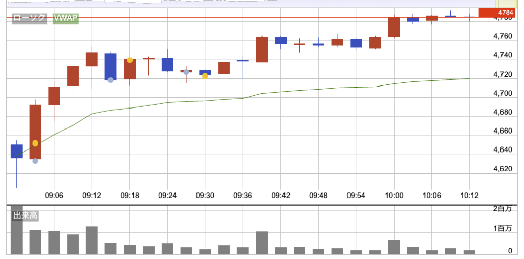 前日とほぼ同水準の4,650円でスタート。寄り付き直後は4,600円割れを試す動きになったけど、そこで止まって反発。その後は上昇が続き、9時台の中でじわじわ高値を更新。最終的には4,760円付近まで上げる展開だった。