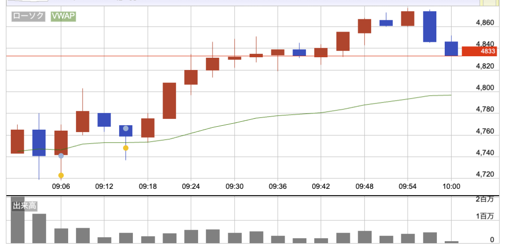 前日から1.5%ギャップダウンして4743円スタート。寄り付き後しばらくは、15分くらいヨコヨコで方向感なし。売りも買いもはっきりしない感じだった。その後はじわじわ買いが入り始めて、前日終値を回復。流れが上に変わって、そのまま4900円が見えるところまで上昇した。
