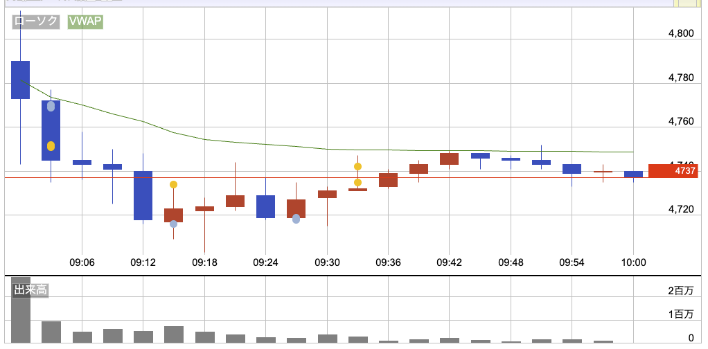 前日とほぼ同水準の4,790円でスタート。寄り付き直後は上下に振れて方向感が定まらなかったけど、最終的には売りが優勢。そのまま4,700円付近まで下げた。そこからは下げ一服で半分弱戻して、以降は値幅が出ないままヨコヨコ。下げ切ったあとに売りが続く感じでもなく、早い時間帯で流れは一度終わっていた印象。