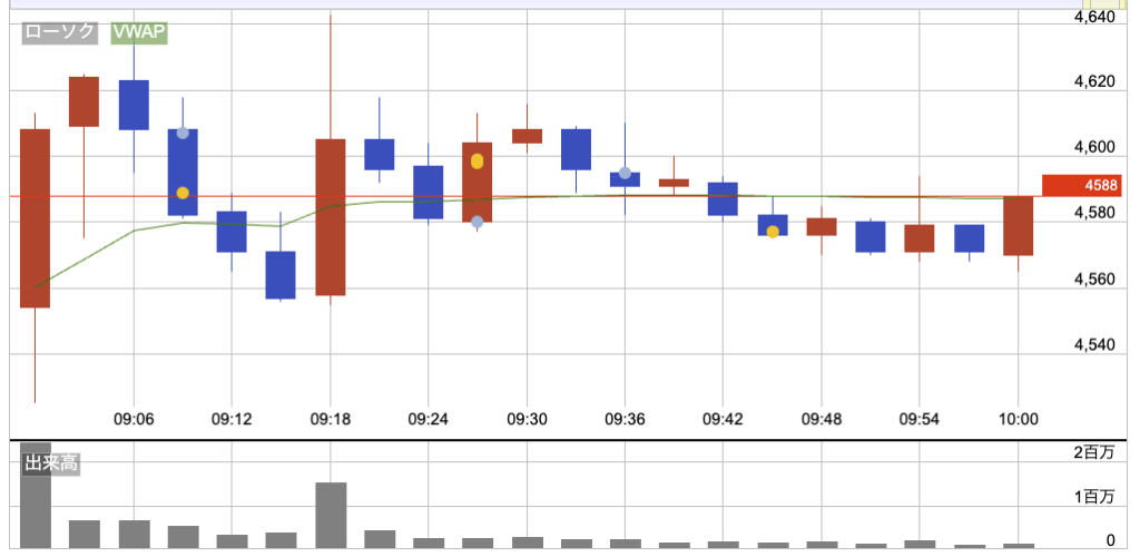 前日から1%ギャップダウンの4554円でスタート。出来高の割にボラは大きく、上下に触れたけど、ほとんど直線のVWAPにだんだんと収束してヨコヨコ相場。