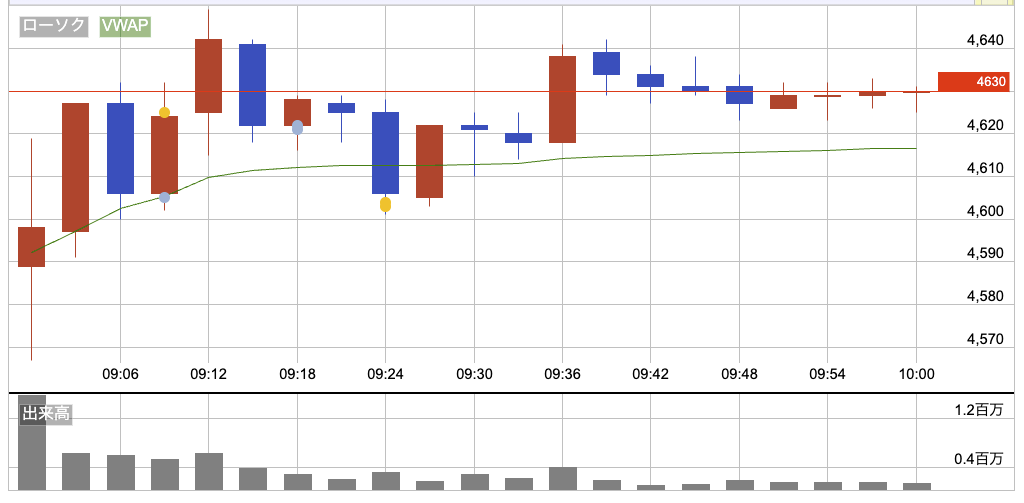 前日比1.5%高の4,589円スタート。出来高は多くないけど、値幅はあってボラは大きめ。全体は上目線だけど、上は重くて何度か跳ね返されていた。下に行く感じはなく、9時台はほぼVWAPの上で推移していた。