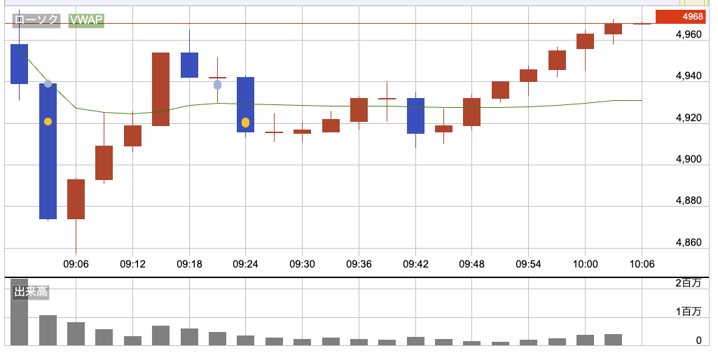 前日とほぼ同じ4958円でスタート。寄りは様子見ムードで、上下に振れるだけで方向感なし。どっちに走るか分からない感じ。