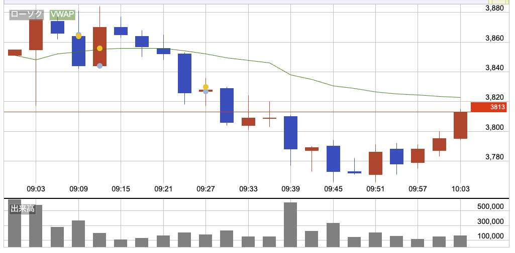 昨日から1.8%下落の3,851円でスタート。序盤はヒゲもボラも大きく、上下に振れる荒い値動き。はっきりした方向は出ずにヨコヨコの時間が続いたけど、その安値を割ってからは売りが強くなって下げが速くなった。寄り付きから見ると、最終的には100円弱下げる値動き。