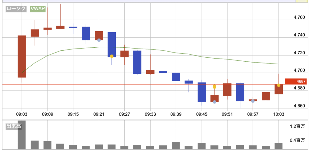 昨日から1.6%下げて4,695円でスタート。寄り付き直後は買いが入って、序盤に100円弱上げて高値つけた。ただ、そのあと勢いは続かず、少しずつ売りが出て上値を切り下げる動き。時間が経つにつれて下げ幅が広がって、9時台の途中にはマイナス圏まで押し戻される展開だった。