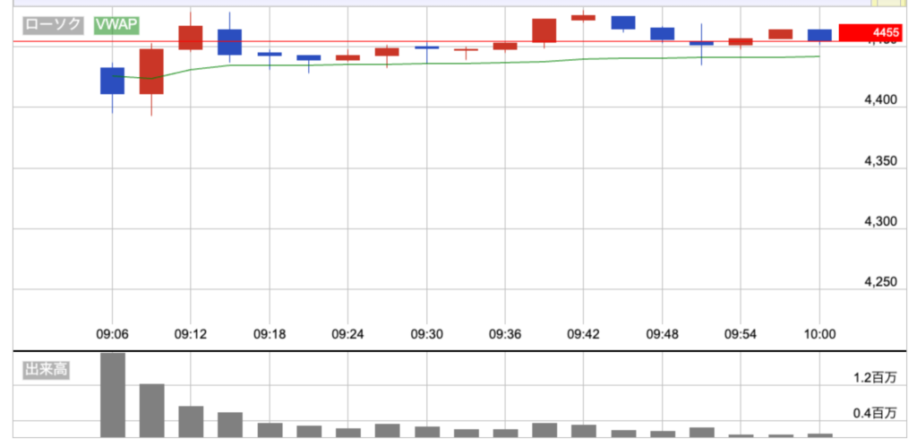 昨日から5%上げて、4433円でスタート。寄り付き直後も買いが続いて、早い時間帯に6%くらいまで一気に上げて高値をつける流れ。初動の勢いはかなり強め。