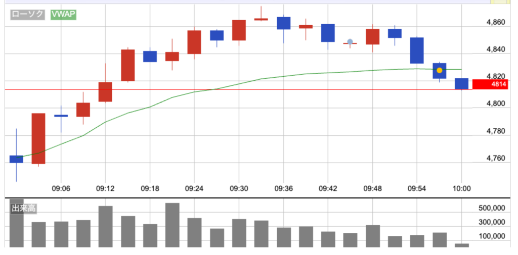 前日比プラス0.63%の4765円スタート。寄り付きの出来高、今年一番少ないんじゃってくらい静かな始まりだった。歩値もおとなしくて、今日どうなるんだろって感じ。