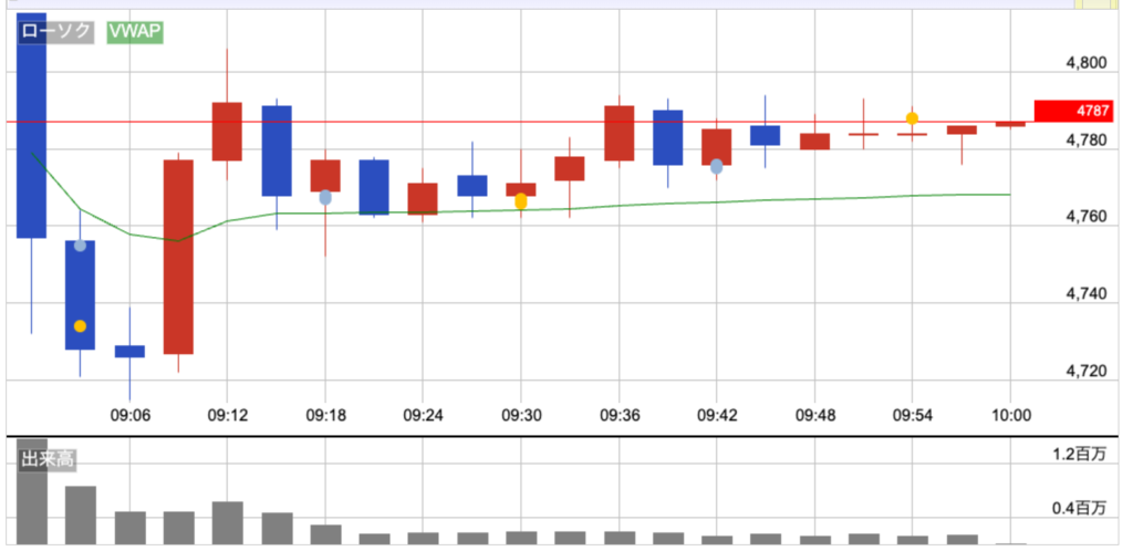 寄り天の形で寄り付きから数分で100円急落、そのまま安値をつけた。最初の下げはかなり強く見えたけど、そこからの戻しが想像以上で下げ幅の半分以上を埋めてきた。