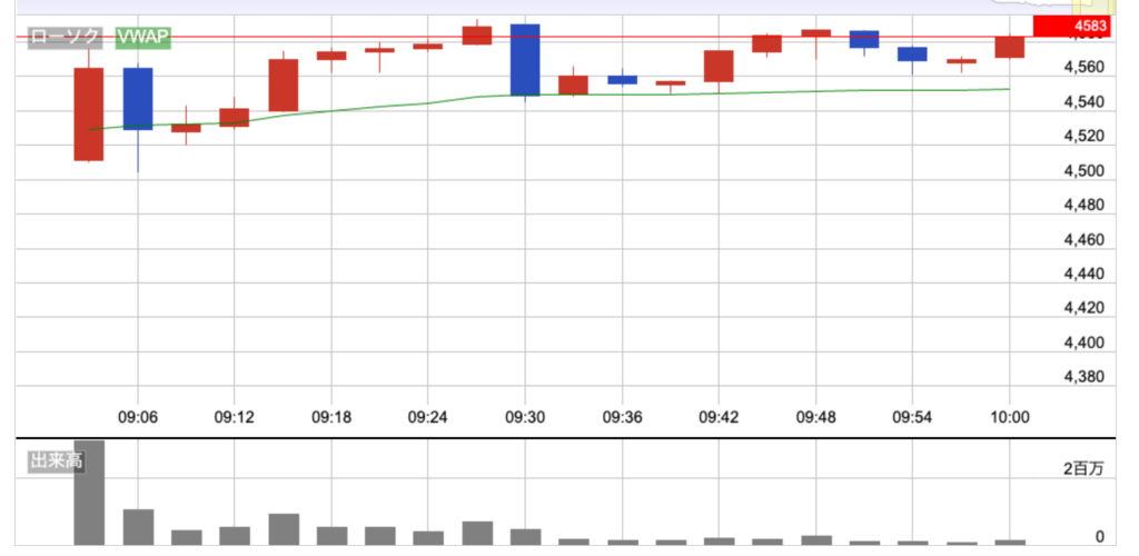 前日から3%上げて、4511円でスタート。寄ってからも上目線でVWAPの上で推移。強めに下げてVWAPタッチするくらいまで下げて何度かVWAP割れチャレンジしたけど支持線になってて、9時台は強い印象。