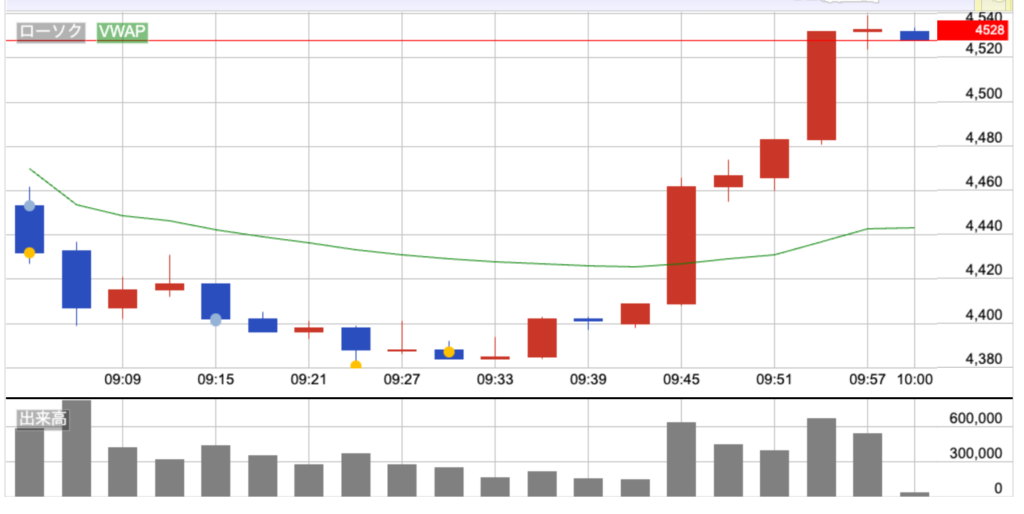 寄り付きからけっこう売られて、30分ほどで100円強の下げ。日経が逆行していてかなり弱い印象だったけど、そこから反転して下げを全部回収、寄り付きを越えるところまで上がってきた。アルゴが反応したのかってくらい、戻しの勢いが強かった。