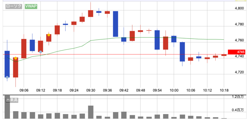 前日から0.1%下げてげて、4749円でスタート。寄り付き直後に安値をつけたけど、そこが底だった。そっからはずっと上目線で、日経と似た値動きで高値を更新し続ける展開。VWAPを割っても戻してて強い動き。
