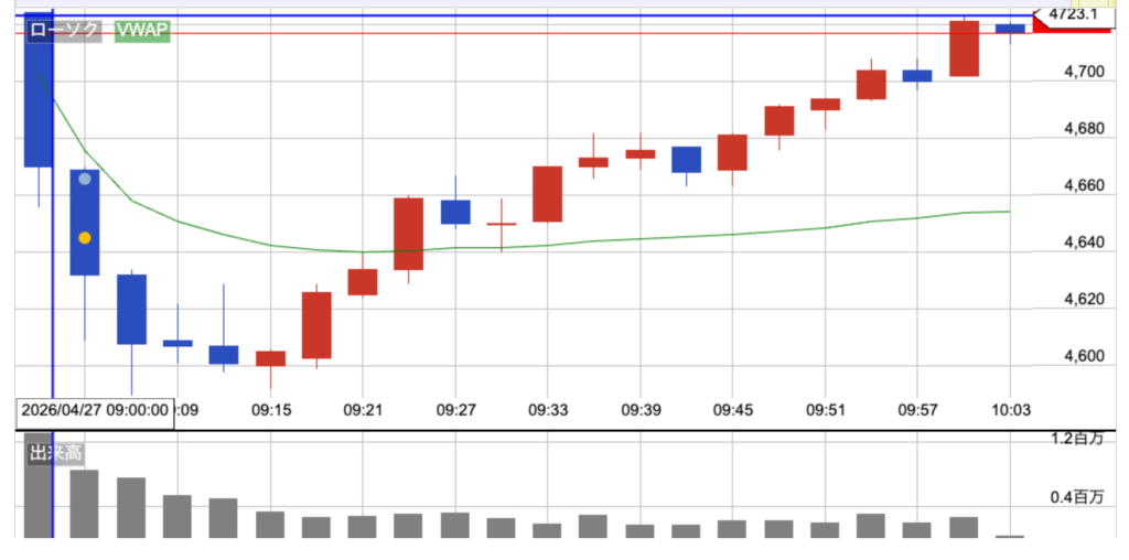 前日から0.3%下げて、4724円でスタート。寄り天で、一気に売られて、4600円付近まで100円以上の急落。初動は完全に売り優勢で、スピードも速かった。